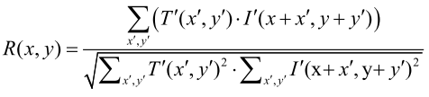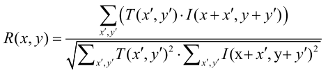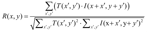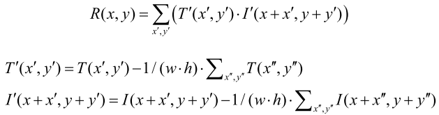 R = Σ(T' * I') = { (템플릿 이미지 - 템플릿 이미지의 평균값) } * { (부분 이미지 - 부분 이미지의 평균값) } 을 더한 것으로,