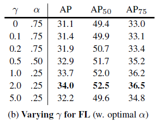 γ는 0~5의 값으로, γ=0이면 Cross Entropy와 같고, 값이 클수록 easy sample의 가중치 값을 줄일 수 있다.