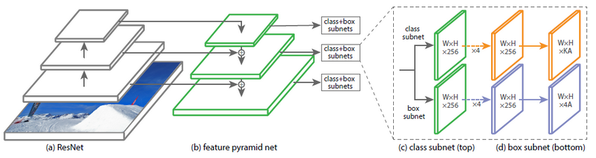 네트워크는 ResNet 기반으로 Feature pyramid를 얻고, pyramid level당 2개의 subnetwork로 구성된다.