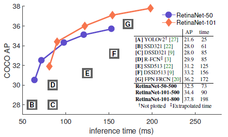 one-stage detector의 class imbalance 문제를 해결하기 위해 hard negative example 학습에 집중할 수 있는 focal loss를 제안하여, 높은 정확도와 속도를 보였다.
